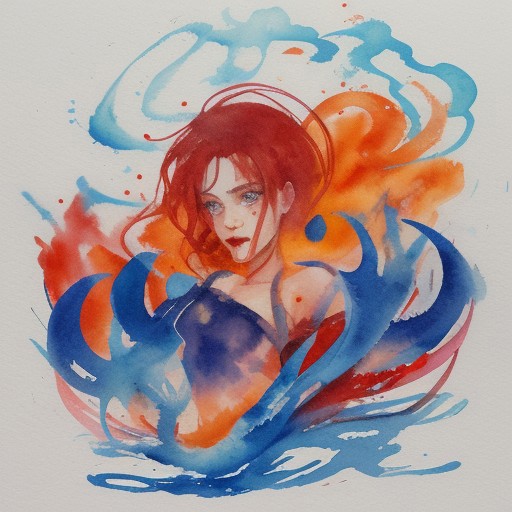 watercolor style. Ink style. Shapes and forms. dynamic woman Colors red and orange and blue only. Smoke. Water. Emotion: happy.