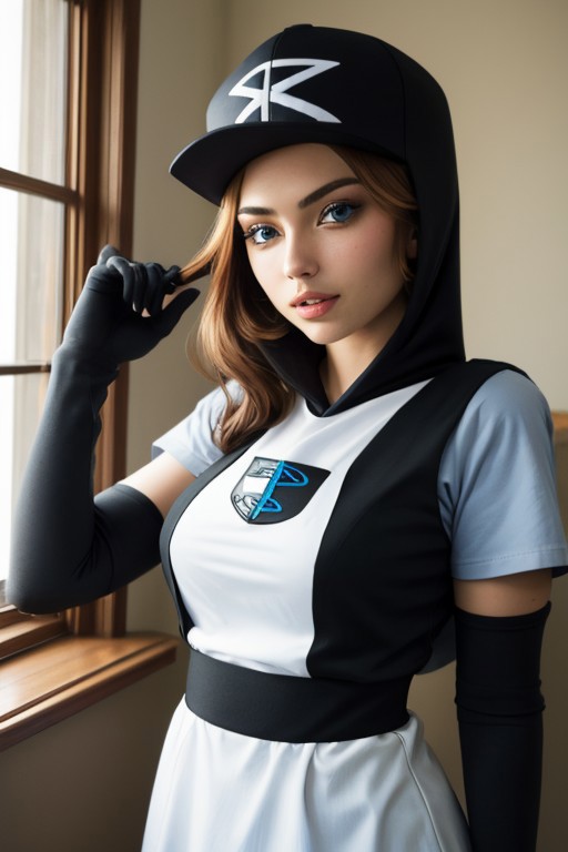 masterpiece, best quality, <lora:pkmntpg-nvwls-v1-000010:1> pkmntpg, hood, white dress, blue gloves, huge breasts, standing, upper body, looking at viewer, parted lips, indoors, science fiction, <lora:hilda:1>, hilda, long hair, hat, baseball cap, looking at viewer,