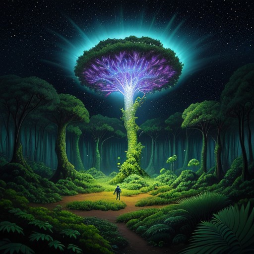 An otherworldly jungle on a distant planet, with towering alien trees and plants that glow with bioluminescent light. The foliage is a mix of vibrant purples, blues, and greens, and strange creatures move quietly through the underbrush. The ground is covered in a soft, moss-like substance that also glows faintly. Above, the sky is filled with unfamiliar constellations and a massive planet looms on the horizon. The atmosphere is mysterious and alive with alien life
