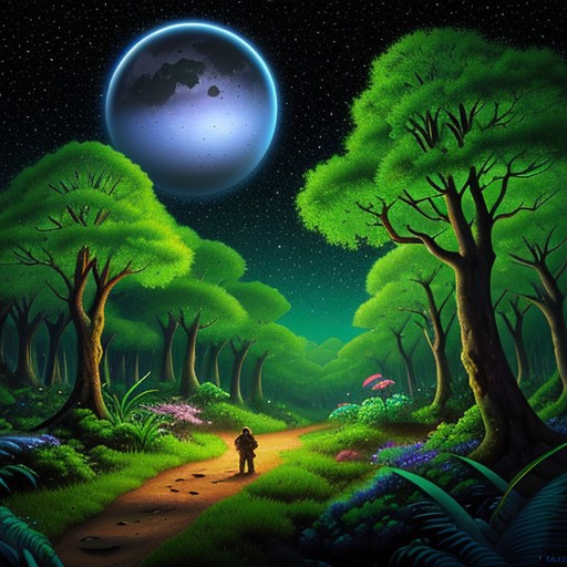 An otherworldly jungle on a distant planet, with towering alien trees and plants that glow with bioluminescent light. The foliage is a mix of vibrant purples, blues, and greens, and strange creatures move quietly through the underbrush. The ground is covered in a soft, moss-like substance that also glows faintly. Above, the sky is filled with unfamiliar constellations and a massive planet looms on the horizon. The atmosphere is mysterious and alive with alien life