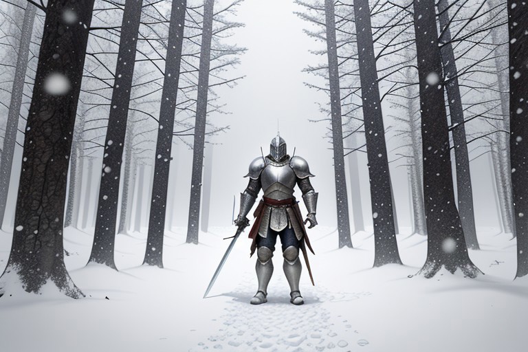 A lone medieval knight in full armor, standing in the middle of a snow-covered forest. Snowflakes gently fall around him, and his breath is visible in the cold air. His sword is drawn, and he stands vigilantly, surrounded by tall, snow-laden trees. The scene feels quiet and tense, with a sense of solitude and impending danger