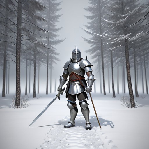 A lone medieval knight in full armor, standing in the middle of a snow-covered forest. Snowflakes gently fall around him, and his breath is visible in the cold air. His sword is drawn, and he stands vigilantly, surrounded by tall, snow-laden trees. The scene feels quiet and tense, with a sense of solitude and impending danger