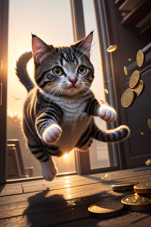jumping Kitty, many Gold coins falling from above, closeup, sunrise background, (masterpiece, best quality:1.4), ultra-high res, 4k, 8k, insanely detailed, insanely beautiful, perfect finish,