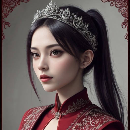 absurdres, highres, ultra detailed, (red, black, white theme:1.3), oni horns, porcelain devil, porcelain demon, porcelain skin official art, face focus, expressionless, looking at viewer, closed mouth, VVI\(ARTSTYLE\), VVI\(FACE\), VVI\(EYES\), VVI\(OA\) (1girl, solo,:1.2), purple hair, low ponytail, red eyes, Imperial court inspired fashion, historical Asian royalty, intricate embroidery, regal colors, ornate headpieces, opulent fabrics, <lora:S_satsuki_kei-30:0.6>, <lora:C_Haze:0.4>, <lora:S_Vivid_Impactful_Style_locon_v4h:0.3> <lora:S_add_detail:1.4> <lora:GoodHands-beta2:1>
