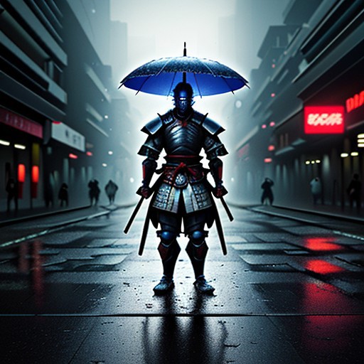 A futuristic samurai in battle armor, standing in the rain with neon lights reflecting off the wet pavement.