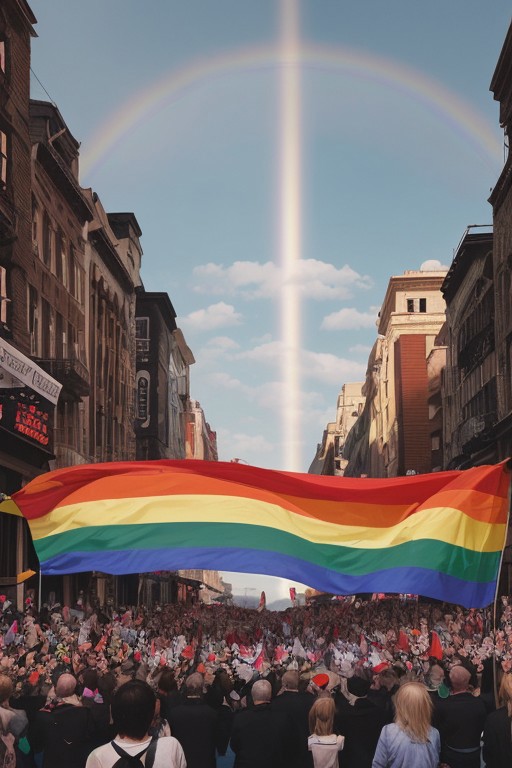 A rainbow in the sky, parade, group of people,dramatic lighting, cinematic,, high resolution, rainbow flags, rainbow banners