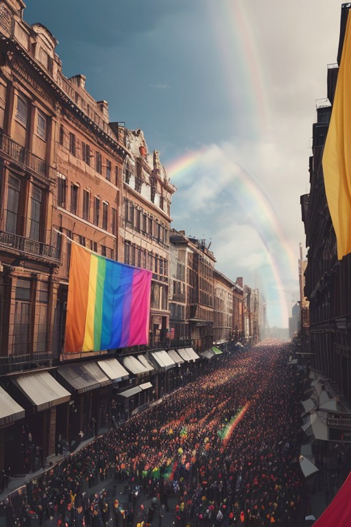 A rainbow in the sky, parade, group of people,dramatic lighting, cinematic,, high resolution, rainbow flags, rainbow banners
