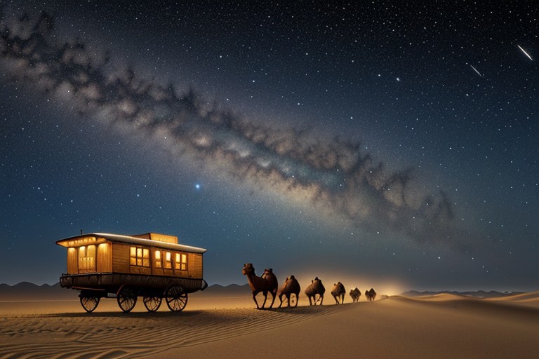 A long caravan of travelers crossing a vast desert under a star-filled sky. Camels and horses carry the travelers and their goods, and the sound of bells and quiet voices fills the night air. The sand dunes stretch out endlessly in all directions, and a cool breeze blows across the desert. Above, the stars shine brightly, and the Milky Way is clearly visible. The scene feels peaceful, with a sense of adventure and the unknown