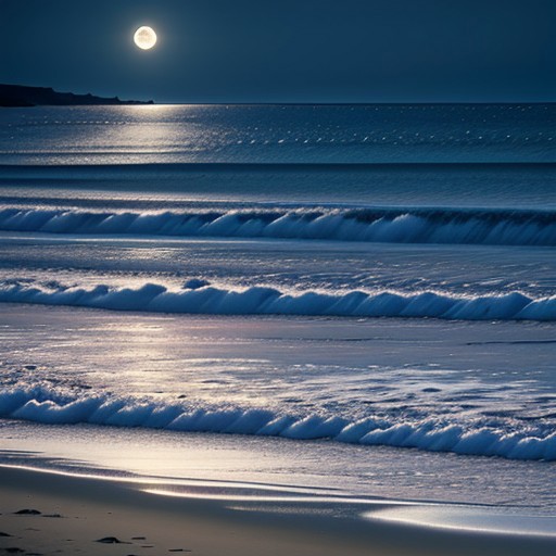 A moonlit beach with bioluminescent waves gently lapping at the shore, and a distant glowing lighthouse.