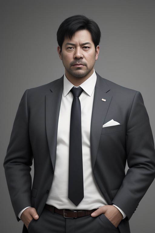 best quality,masterpiece,(realistic:1.2)quality,realistic,masterpiece,Highly detailed,1boy,office man,adult,asian,black hair,suit,standing,hand in pocket,grey_background,moody lighting,full_shot,frontlight,highres,absurdres,incredibly_absurdres,huge_filesize,