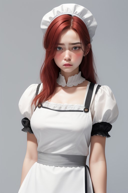8k uhd, masterpiece, best quality, high quality, absurdres, ultra-detailed, (high Contrast), (highly detailed), (red hair, long hair, large breasts, 1girl, solo), ( maid uniform, maid cap, puffy sleeves, short sleeves, black blouse, white waist apron ), (gray background:1), (standing, upper body shot), (sad, embarrassed, full-face blush, face detail, beautiful, cute)
