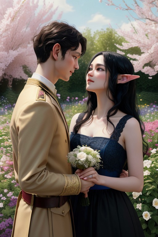 classical portraiture of a (human husband with round human ears with short black hair) and (elf wife with long black hair and blue eyes), holding hands looking at each other in their garden, the smell of freshly bloom flowers in the air, (Masterpiece:1.3) (best quality:1.2) (high quality:1.1), (high detail:1.4), (highres:1.4), (ultra detailed:1.4), classical portraiture,