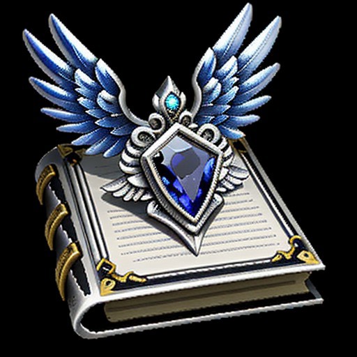 (Blue and silver), fantasy, divine glow, book, studded with a sapphire gem, silver angel, silver wings, gameicon, masterpiece, best quality, masterpiece, HD Transparent background, (simple background:1.2), dark background, common item