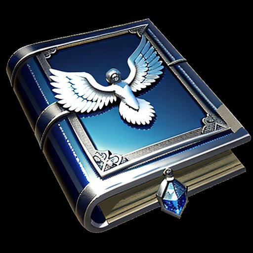 (Blue and silver), fantasy, divine glow, book, studded with a sapphire gem, silver angel, silver wings, gameicon, masterpiece, best quality, masterpiece, HD Transparent background, (simple background:1.2), dark background, common item