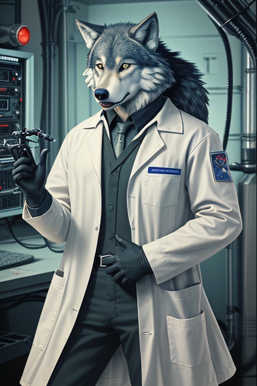 vintage_sci-fi an anthropomorphic wolf dressed as a technician or scientist