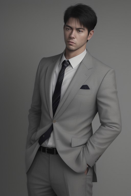 best quality,masterpiece,(realistic:1.2)quality,realistic,masterpiece,Highly detailed,1boy,office man,adult,asian,black hair,suit,standing,hand in pocket,grey_background,moody lighting,full_shot,frontlight,highres,absurdres,incredibly_absurdres,huge_filesize,