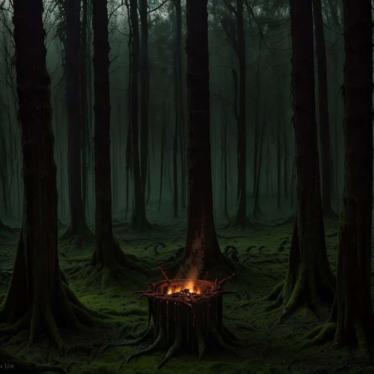 A SLR photograph, a 4K image, a highly detailed image, very dark forest, very dark sky, no light, black image, eerie and scary forest at night, Elphaba witch by her black cauldron with green glowing liquid in, complete pitch black darkness, very dark night in a old scary forest with dead twisted tree trunks, eerie green mist and glow everywhere, completely dark sky, moss and rocks on the forest floor,complete darkness