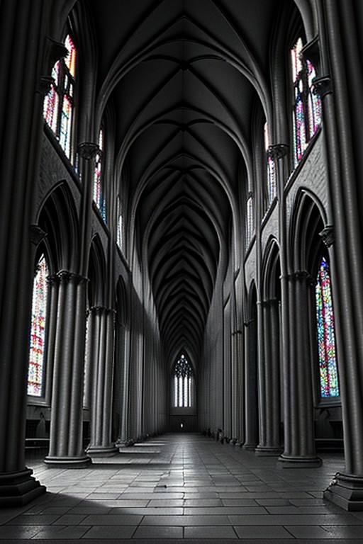 A dark 2D Gothic cathedral interior, with tall, ominous columns and broken stained glass windows. Dim light filters through, casting long shadows across the stone floor. The atmosphere is cold and foreboding, with an air of ancient mystery
