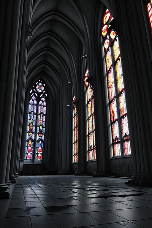 A dark 2D Gothic cathedral interior, with tall, ominous columns and broken stained glass windows. Dim light filters through, casting long shadows across the stone floor. The atmosphere is cold and foreboding, with an air of ancient mystery