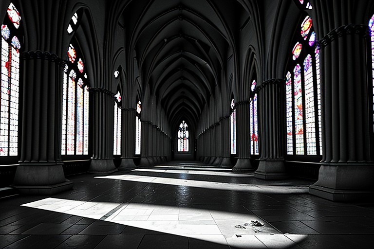 A dark 2D Gothic cathedral interior, with tall, ominous columns and broken stained glass windows. Dim light filters through, casting long shadows across the stone floor. The atmosphere is cold and foreboding, with an air of ancient mystery