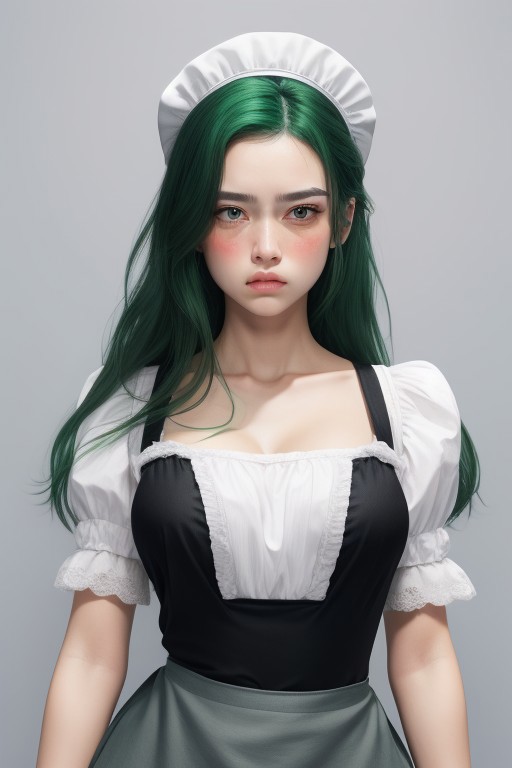 8k uhd, masterpiece, best quality, high quality, absurdres, ultra-detailed, (high Contrast), (highly detailed), (green hair, long hair, large breasts, 1girl, solo), ( maid uniform, maid cap, puffy sleeves, short sleeves, black blouse, white waist apron ), (gray background:1), (standing, upper body shot), (sad, embarrassed, full-face blush, face detail, beautiful, cute)
