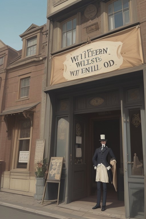 Exterior view of a Victorian-style Milliner shop with a wooden sign, with a selection of hats in the window. A victorian man wearing a very large top hat stands proudly at the door. A banner is draped across the wall saying ("Hatters will say this is AI":1.25), whimsical, funny, illustration