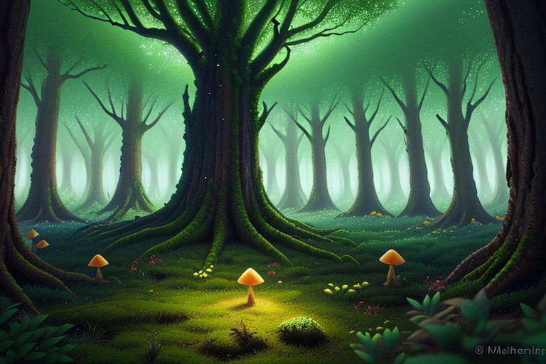An enchanting forest illuminated by clusters of glowing mushrooms and plants. Tall, ancient trees tower overhead, their leaves shimmering with a faint magical glow. The ground is covered in vibrant moss, and small woodland creatures can be seen darting between the trees. The air feels thick with magic, and the atmosphere is peaceful yet mysterious