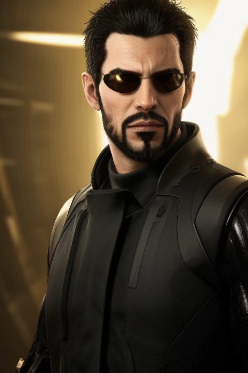 a portrait of a cyberpunk guy, 1boy, looks like Adam Jensen from the game deus ex human revolution, jensenDX, black hair, augmentations visible on skin, black sunglasses, environment lights mirroring on sunglasses, serious looking, beard, black leather trench coat, metallic and black chest armor, cybernetic connections and details from neck to chest and mechanical arms, holding high arm with nano blade exposed, realistic digital art, closeup, bokeh effect, focus on face, pic dominated by black, yellow and gold colors, outdoors by night, neon scifi street,