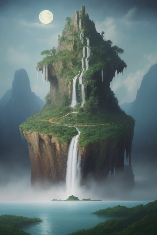 Ghiblistyle fantasy oil painting of a lush alien world, there is a large island floating in the sky. There is a majestic waterfall coming from the floating island