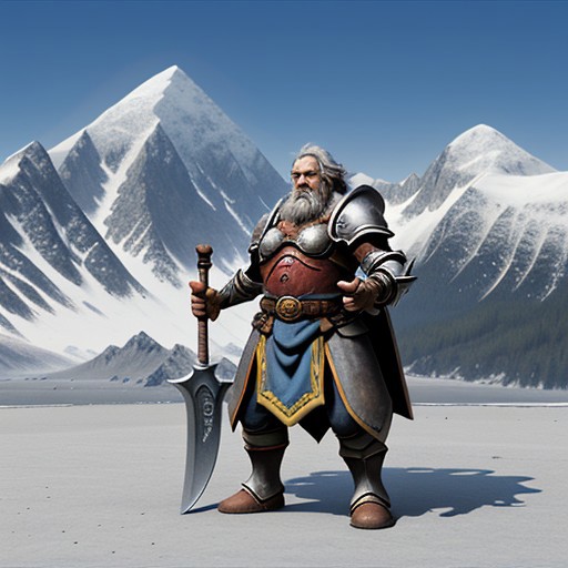 solo, dwarf, two-handed axe, light armor, mountain on background