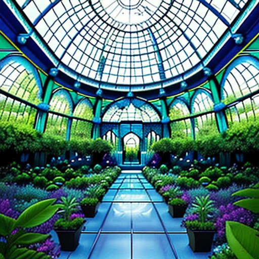 A futuristic greenhouse filled with exotic, bioluminescent plants, with never-before-seen species glowing in shades of blue, green, and purple. Floating glass pathways wind through the giant trees, and drones hover in the air, tending to the plants. Soft sunlight filters through the glass dome, reflecting the vibrant colors of the leaves
