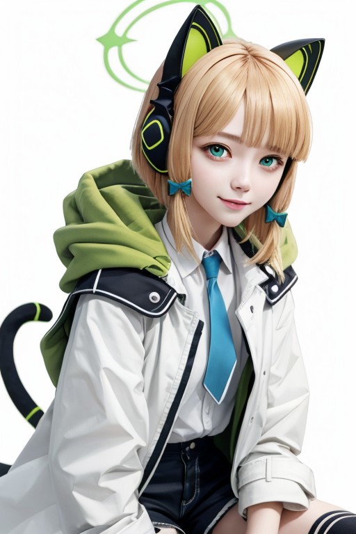 ((masterpiece,best quality)), 20 y.o, absurdres, BREAK, , <lora:Midori_BlueArchive_Citron:0.8>, zzMidori, blonde_hair, animal_ears, fake_animal_ears, animal_ear_headphones, headphones, bow, short_hair, cat_ear_headphones, halo, green_eyes, hair_bow, tail, green_halo, cat_tail, green_bow 1girl, black_thighhighs, blue_necktie, collared_shirt, long_sleeves, looking_at_viewer, simple_background, solo, white_background, white_jacket, white_shirt, black_shorts, blush, black_footwear, full_body, open_jacket, sitting, closed_mouth, hood, open_mouth, wide_sleeves , BREAK, hip to the side, contrapposto, cowboy shot,, BREAK, solo, smile, looking at viewer, cowboy shot,