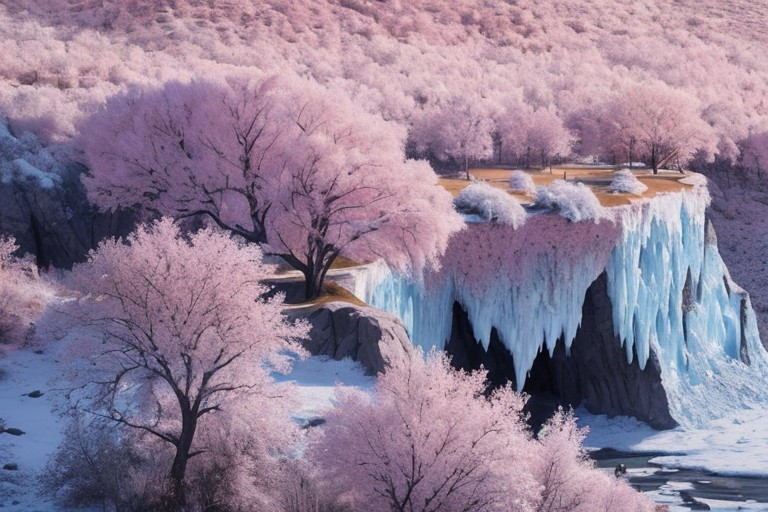 hillside of a snowy desert, outback, desert cliffs, frost, icy ice, ((several colorful trees growing sideways off the cliff), (different tree colors)), pink trees, red trees, purple trees, blue trees, orange trees