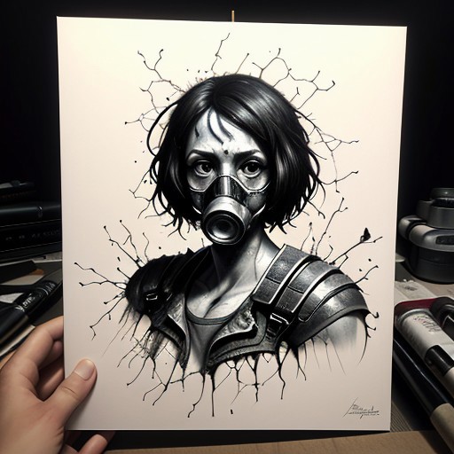 by Bastien Lecouffe-deharme , By carne griffiths and wadim kashin, artwork by Milo Manara , a person wearing a gas mask, depicted in the style of Rembrandt, with rich, dark tones and dramatic lighting , looking at viewer, coherent background, in the style of blink-and-you-miss-it detail, full body, desaturated colours , hyper realism, fine airbrush art , hyper detailed, exaggerated anatomy