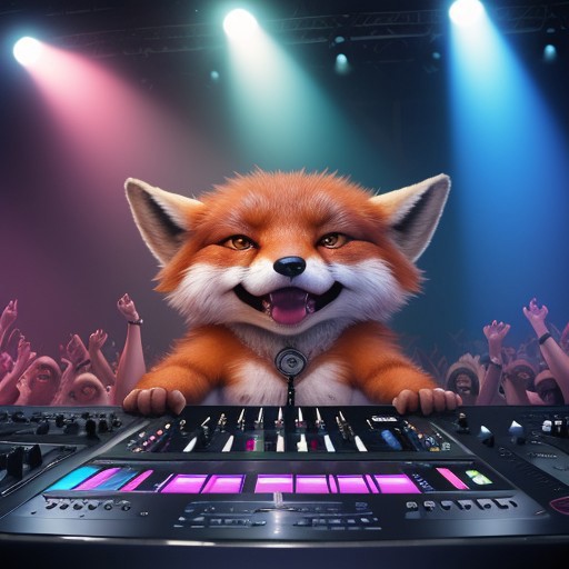 breathtaking professional dynamic and exciting photograph. A professional award-winning photoshop cinematic photograph of a fox on stage DJing to a crowd of anthropomorphic animals at a flashy and hype rave, extreme detail, trending on artsy, lensculture, apeture, nikon d750, hdr, dci-p3, artificial blue and pink lighting