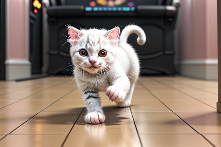 Capture a full hyper-realistic photograph of an adorable white kitten running in a cinema, cutest in civitai, side view, chubby cat, close up, c4d, blender, raytracing, unreal engine 5, render 3d,