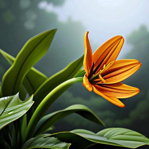 A macro, photorealistic image of a red and orange flame lily held by a female vampire surrounded by thick green leaves and plants in a rainforest in Zimbabwe. The lily is damp from a light rain with a cool, blue night light.CyberRealistic_Negative. vmpr