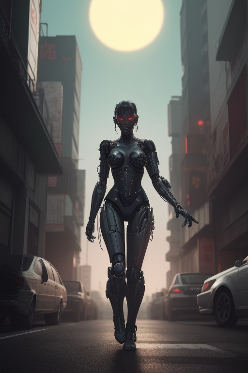 cyberpunk, anime, Cyber Punk cyborg Samurai woman standing wide stride with a red sun and city behind, highly detailed Mayhem style splattered Silhouette, background bizarre techno ghetto transmission, style minimalist, conceptual art posing Japanese, conceptual, 3d render, illustration, cinematic, photo epic action, cinematic, award winning artwork, many details, patterned illumination, bad VHS tape image artifacts