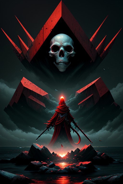dark fantasy theme, A grim reaper in a flowing red robe sits on a rocky outcrop by a body of water, holding a massive scythe. close up of face is hidden, adding to the mystery. A massive full moon with a reddish glow illuminates the scene, casting eerie light across swirling red and black clouds. The moonlight reflects off the water, disturbed by sea of floating human skulls. Birds fly toward the moon, adding movement. The image is rich in contrast with dramatic lighting, enhancing the dark, foreboding atmosphere, <lora:aidmaMJ6.1:0.6>, <lora:fluxenhancer:0.3>, <lora:aidmaAbadonedHorror:0.6> epic, cinematic colors, masterpiece, detailmaximizer, midjourneyv6.1, CyberRealistic_Negative,