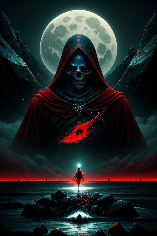 dark fantasy theme, A grim reaper in a flowing red robe sits on a rocky outcrop by a body of water, holding a massive scythe. close up of face is hidden, adding to the mystery. A massive full moon with a reddish glow illuminates the scene, casting eerie light across swirling red and black clouds. The moonlight reflects off the water, disturbed by sea of floating human skulls. Birds fly toward the moon, adding movement. The image is rich in contrast with dramatic lighting, enhancing the dark, foreboding atmosphere, <lora:aidmaMJ6.1:0.6>, <lora:fluxenhancer:0.3>, <lora:aidmaAbadonedHorror:0.6> epic, cinematic colors, masterpiece, detailmaximizer, midjourneyv6.1, CyberRealistic_Negative,