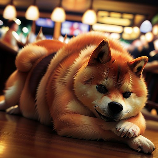 a photo of a (shiba inu) sleeping inside a crowded bar, high detail, ultra graphics, cinematic dramatic light, intricate details, advanced perspective, bokeh, square image, <lora:doge:0.8>, night