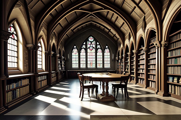 A grand library in a medieval castle, with high vaulted ceilings and towering shelves lined with ancient books. Soft light filters through stained glass windows, casting colorful reflections on the stone floor. A large wooden table sits in the center, covered with open books and scrolls