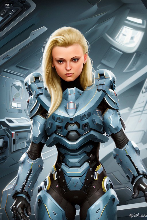 (ca45mv7-100), RAW photo of woman, fully armored, fully clothed, blonde hair, portrait on a grey steel spaceship interior background, sharp focus, best quality, extremely detailed, spaceship interior, spacecraft, helmet removed, gloves, gloved hands, Female focus