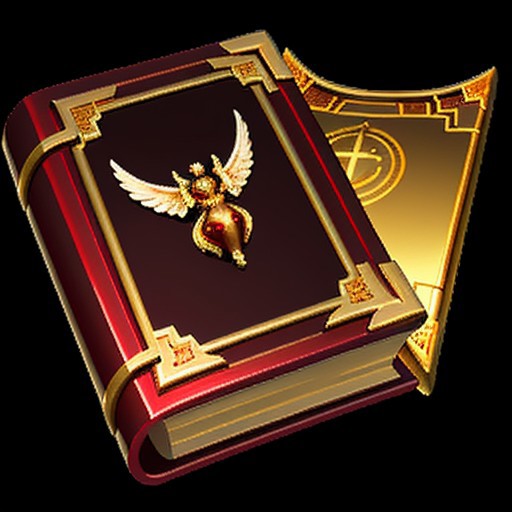 (((dark red and gold))), fantasy, divine glow, book, studded with a glowing red gem, angel and demon, gameicon, masterpiece, best quality, masterpiece, HD Transparent background, (simple background:1.2), dark background, common item