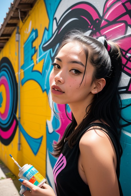 Vivid street portrait of a female graffiti artist, looking at viewer, capturing her colorful attire and the mural she is working on, taken while she is adding the finishing touches to her artwork holding a spray paint can two inches from the mural, upper-body shot, set against an urban wall filled with vibrant graffiti, lit by natural daylight casting dynamic shadows, shot from a low angle to include the subject and her stylistic self-portrait artwork, digital photo, in the style of Martha Cooper. (perfect face), (8K, 16k, uhd, dslr), (RAW photo:1.2), (best quality:1.4), (high quality:1.4), (masterpiece:1.2), (realistic:1.3), (photo-realistic:1.4), ultra-detailed, (grainy:0.4)