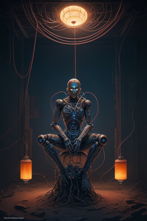 In a surreal and futuristic tableau, a humanoid figure with a complex lattice of mechanical features assumes a grotesquely contorted pose, defying human anatomy. Seated in the desolate remnants of a once-thriving laboratory, shadows dance around it as a network of cables and wires tether the figure to an ominous, pulsating orb hovering overhead. This orb bathes the figure in an otherworldly glow, revealing the intricate, rusted textures and esoteric symbols that cover its surface, as if the metal itself were alive and writhing. Beyond the figure, the backdrop unfurls into a dystopian dreamscape, with swirling cosmic gases and a dim, fading sun on the edge of extinction. To the left, a landscape of biomechanical formations, equally as intricate as the figure, is dimly illuminated by the sputtering light of orange-tinted lanterns. The scene is steeped in a palette of dark blues and purples, punctuated by the cold sheen of metal, instilling a profound sense of encroaching dread and existential angst.midjourneyv6.1, Cinematic style, realism, cinematic quality, K_oilpastel Oilhanfu