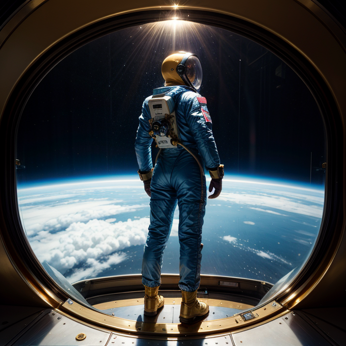 back view of an astronaut looking out through the window of a spaceship, blue astronaut suit, solo, (full body), (((astronaut helmet, reflect gold symbols))), protecting the holy cheeseburger, blue perfect gloves, high resolution, hyper realism, <lora:more_details:0.7>
