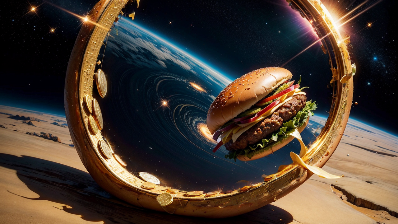 ultra wide view, art by Victo Ngai, ((cyberpunk city, (gold coins), green neon lights)), to the space ocean, the holy cheeseburger, high resolution, hyper realism, art by Victo Ngai, <lora:more_details:0.7>