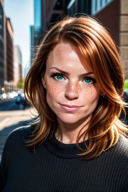 close-up portrait of a woman wearing a black sweater against an urban background, outdoors, daylight, Claire, freckles, ginger