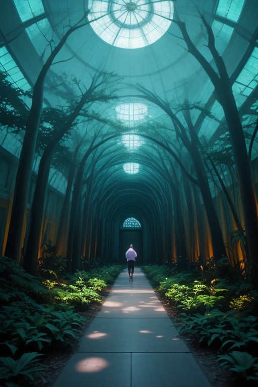 A futuristic greenhouse filled with exotic, bioluminescent plants, with never-before-seen species glowing in shades of blue, green, and purple. Floating glass pathways wind through the giant trees, and drones hover in the air, tending to the plants. Soft sunlight filters through the glass dome, reflecting the vibrant colors of the leaves
